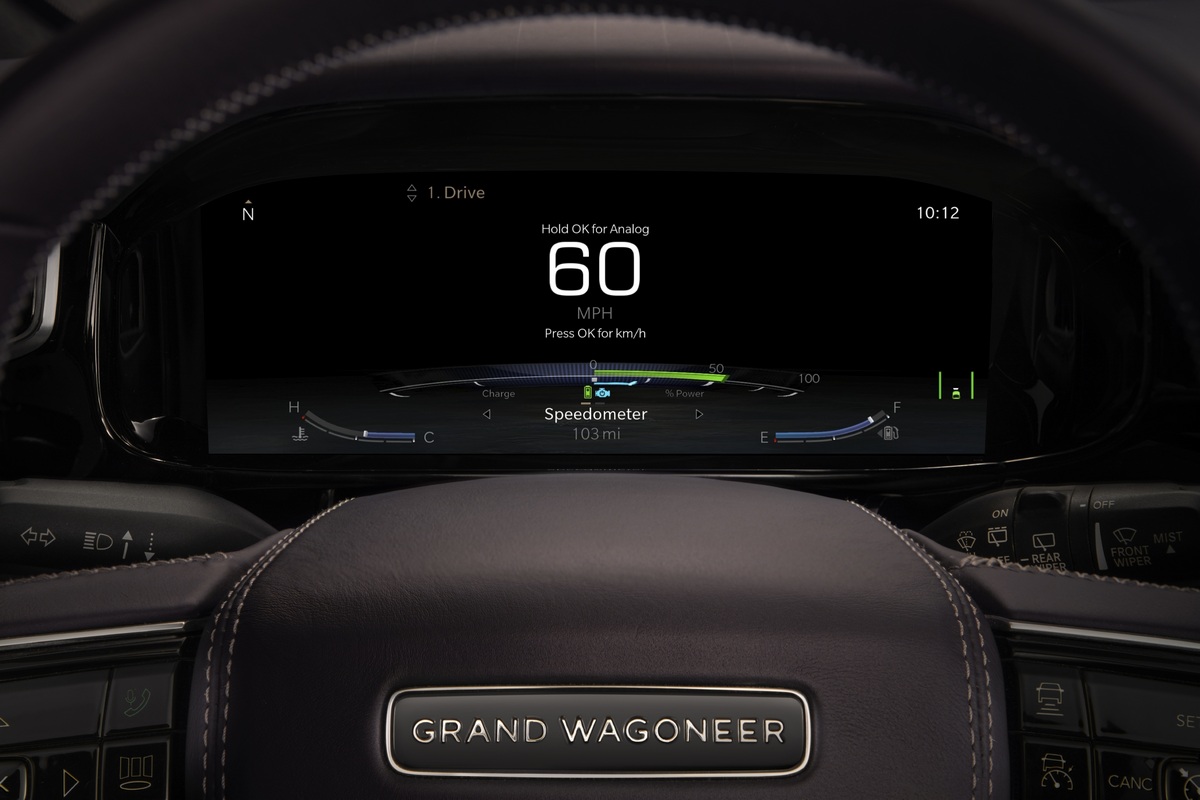 El Wagoneer Concept cuenta con una superficie de 12,3 pulgadas para el cuadro de instrumentos digital. En la consola central nos encontramos con dos pantallas: una de 12,1 pulgadas, que sirve para manejar el sistema de info-entretenimiento Uconnect 5 en el que se incluyen numerosos servicios digitales en línea, y otra de 10,25 pulgadas para controlar otras funciones.