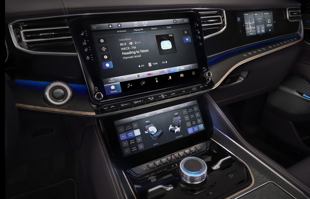 La sensación que Jeep ha recreado en el habitáculo se define con una sola palabra: lujo. En el panel de instrumentos ha dispuesto una lámina de cristal de ónix, el nombre del modelo inscrito en aluminio e incrustaciones 3D de madera de sicómoro tratada térmicamente. Los tapizados son de la máxima calidad y el equipamiento tecnológico marca las diferencias por una razón: el número de pantallas.