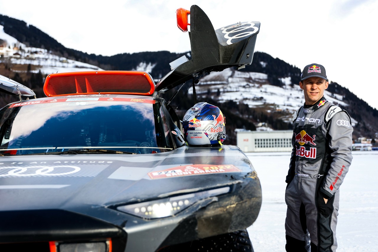 Se trataba de un intercambio de coches muy especial: con Mattias Ekström en el asiento del copiloto, Ken Block probó sobre nieve y hielo el Audi RS Q e-tron que participó en el Rally Dakar con el dorsal 224.