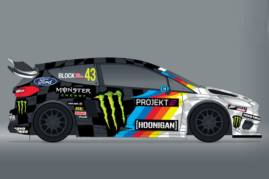 En el tweet se muestran, además, dos bocetos de los laterales del coche, que parece no tener modificaciones aerodinámicas distintas a lo habitual en los ejemplares que corren en RX. En la decoración la carrocería bitono blanca y negra comparte protagonismo con diversas líneas de colores, así como con los patrocinadores habituales del piloto, como Monster o su propio equipo, Hoonigan.
