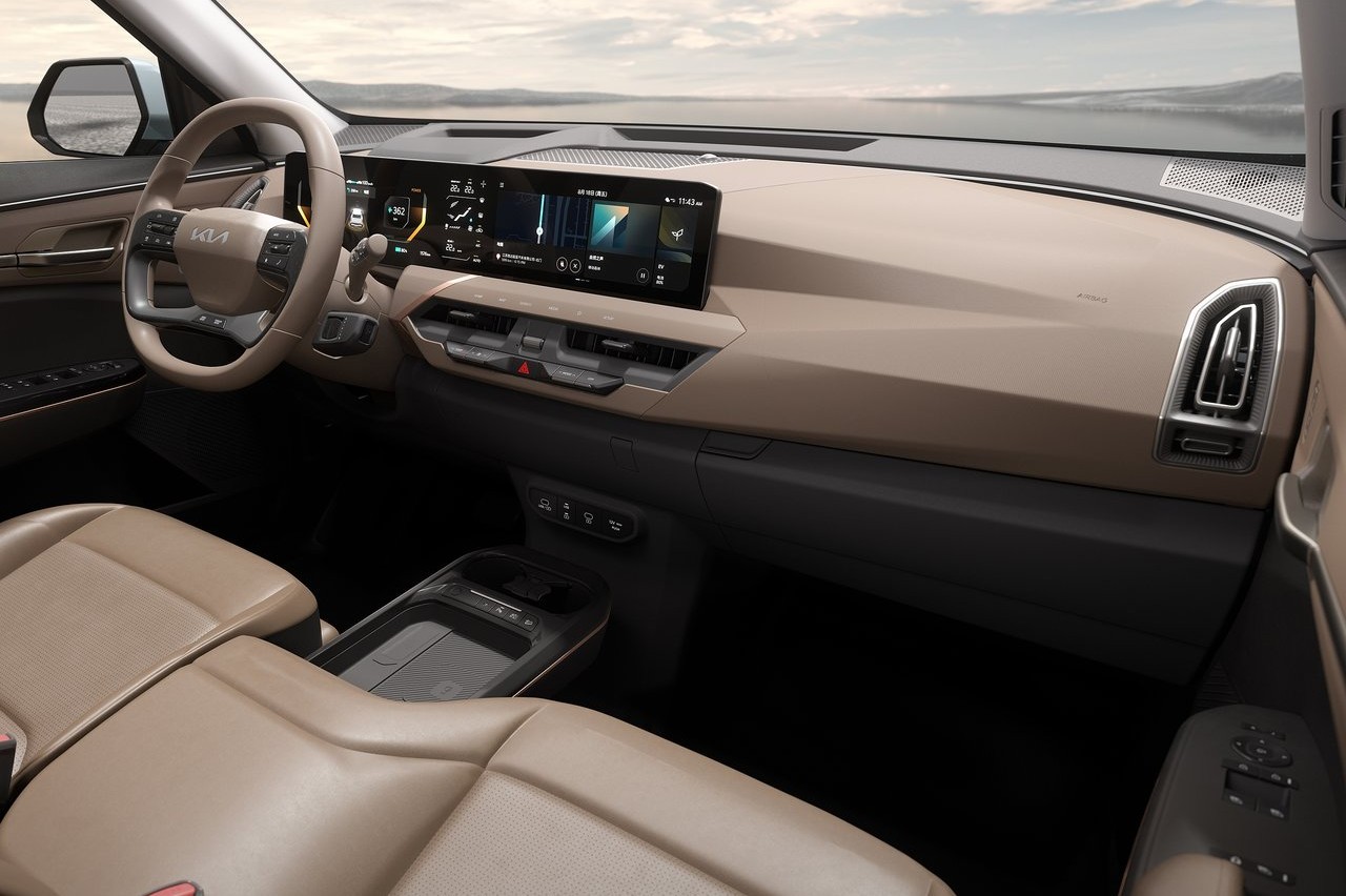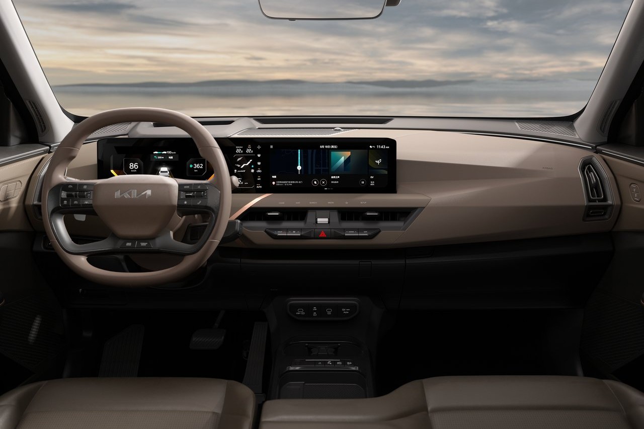 Como ocurre en los últimos modelos de Kia, el nuevo EV5 luce un diseño muy vanguardista y minimalista, con un salpicadero muy horizontal y despejado de botonería. El minimalismo lo encontramos también en el túnel de transmisión, un espacio recortado que se puede utilizar como zona de carga inalámbrica. El centro del salpicadero está presidido por dos pantallas digitales unidas de 12,3 pulgadas, una hace de instrumentación y la otra para volcar el contenido multimedia.