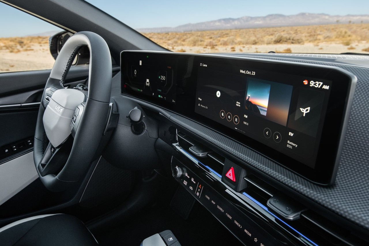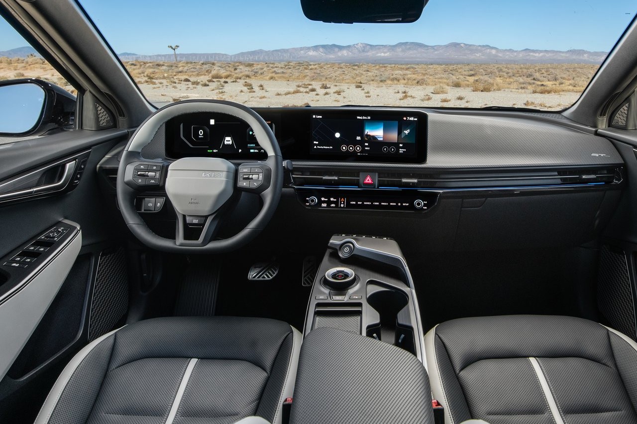 En el interior, el Kia EV6 2025 adopta un nuevo cuadro de mandos digital curvado con dos pantallas de 12,3 pulgadas personalizables a través de Kia Connect Store. Otros cambios incluyen un volante rediseñado, un nuevo acabado para la consola central y materiales adicionales para mejorar el aislamiento del habitáculo. El equipamiento tecnológico se ha mejorado con más ayudas ADAS.