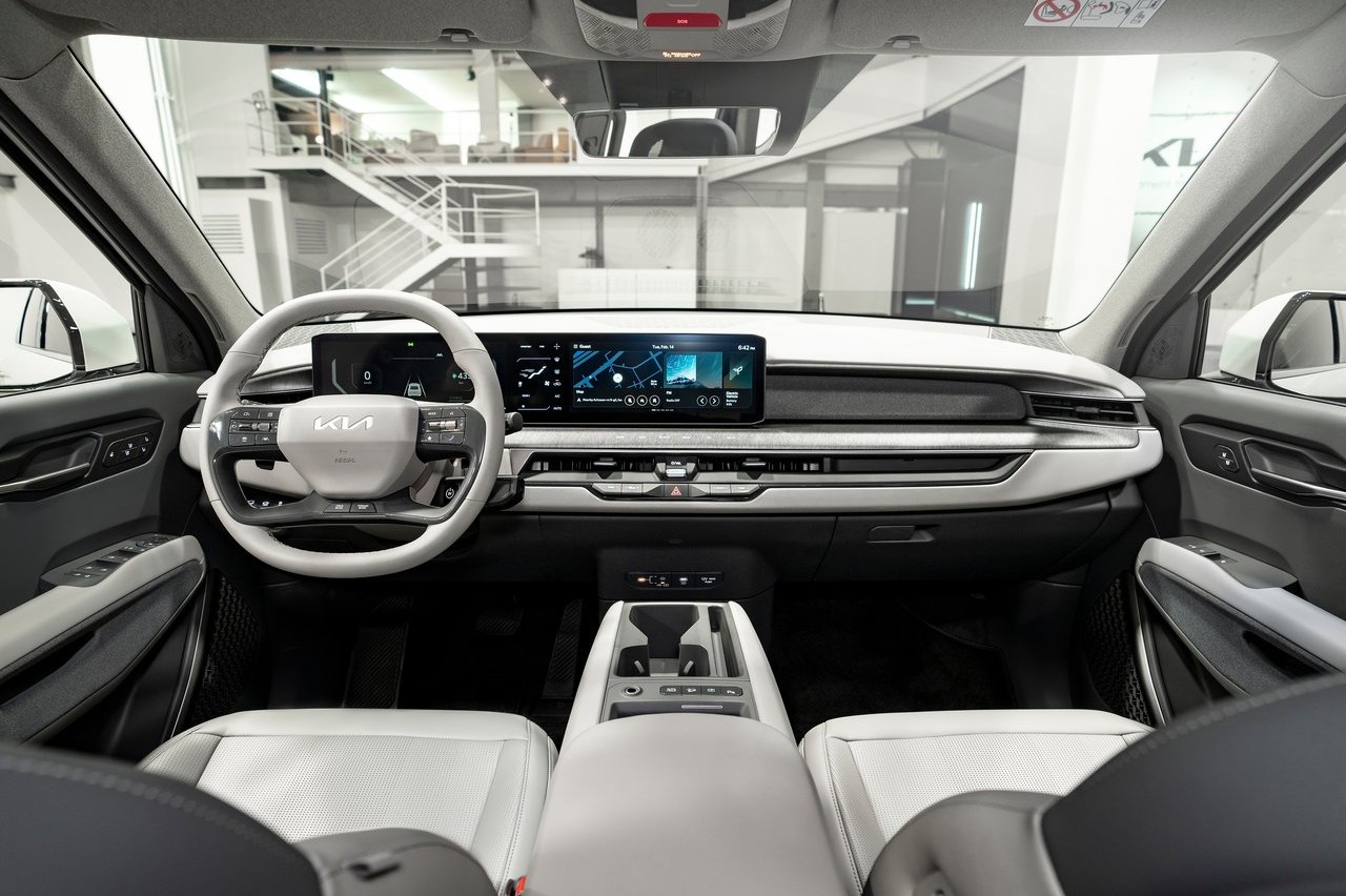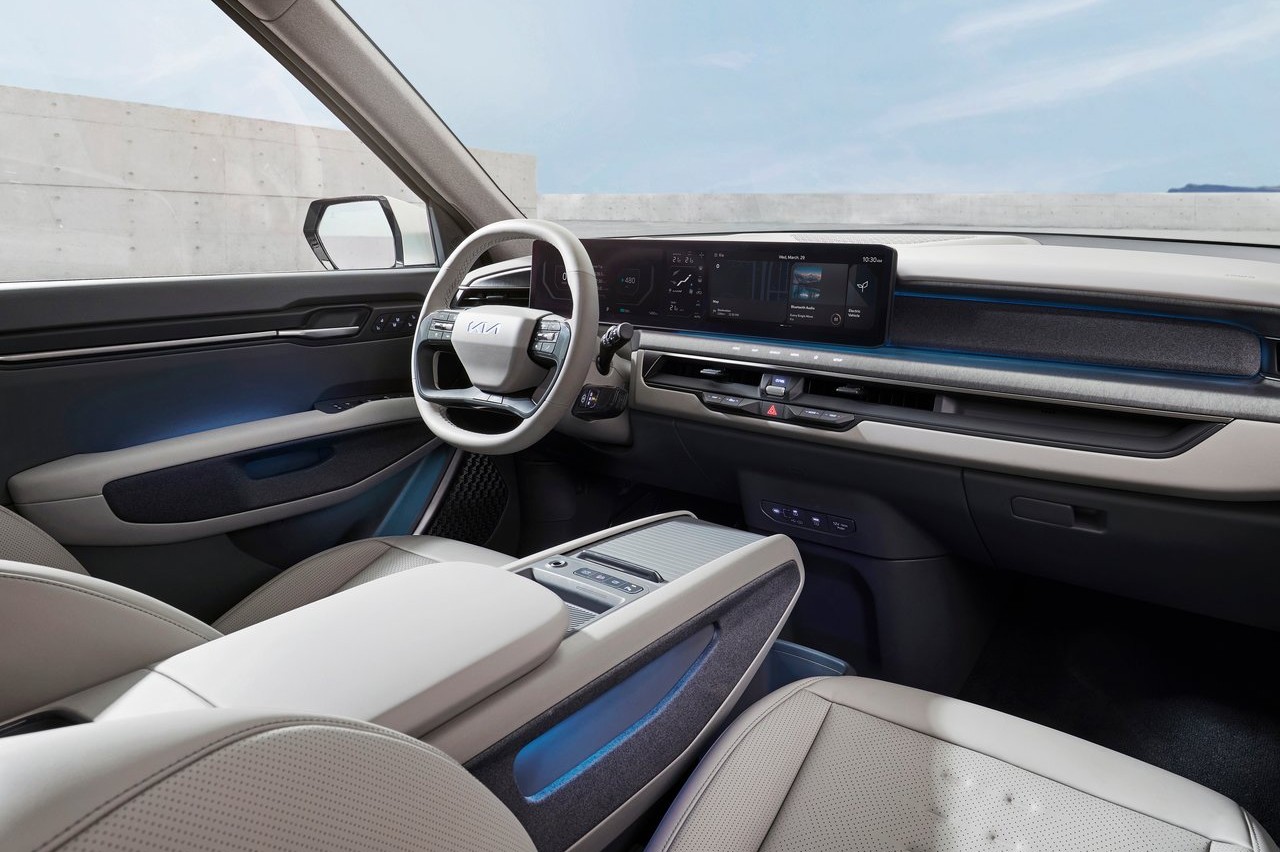 Kia ha optado por un diseño muy sencillo y minimalista para el interior del EV9. Destaca el salpicadero panorámico, abierto y flotante que se extiende desde el volante hasta el centro del vehículo, presidido por dos pantallas táctiles de 12,3 pulgadas integradas con una pantalla de segmento de 5 pulgadas que mejoran la experiencia digital y ofrece un control sin esfuerzo de las funciones del vehículo.
