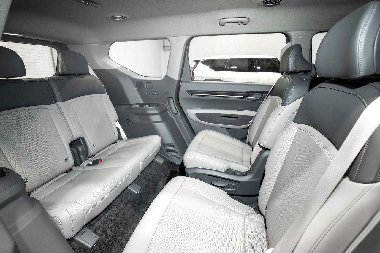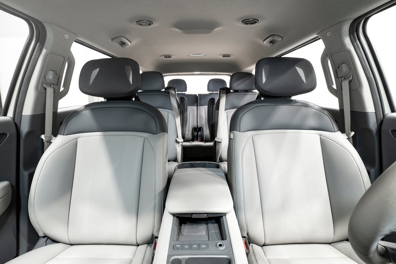 En el interior del SUV eléctrico de Kia encontramos tres filas de asientos en configuración de seis y siete plazas. Los pasajeros de la primera y segunda fila pueden reclinar simultáneamente sus asientos para relajarse y descansar mientras el vehículo se carga. Los asientos de la segunda fila pueden girar 180 grados sin esfuerzo para que los ocupantes puedan interactuar con los de la tercera fila. La tercera fila también está equipada con portavasos y puntos de carga para dispositivos móviles.