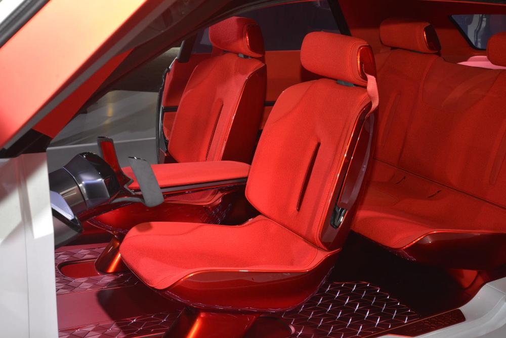 El estilo distintivo continúa en el interior de color Lava Red, con asientos delanteros tapizados en Bouclé que parecen flotar sobre el suelo e integran diseños geométricos. Las pantallas tradicionales han sido reemplazadas por un Head-Up Display que abarca todo el ancho del parabrisas y que se controla mediante un panel de instrumentos con pantalla táctil interactiva.
