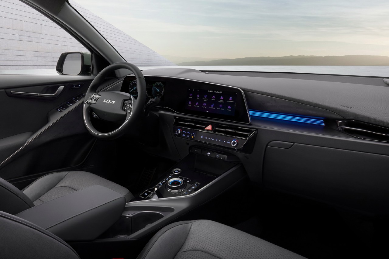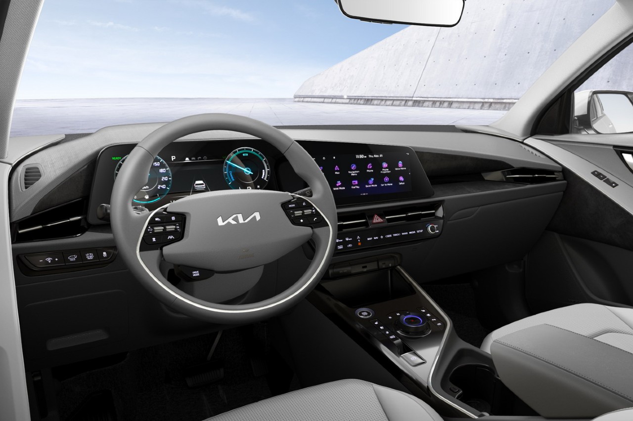 Se aprecia un cuadro de instrumentos digital combinado con la consola central, aunque no se han desvelado sus dimensiones. También parece que los controles de la climatización son digitales o hápticos, pero Kia no lo ha confirmado aún.