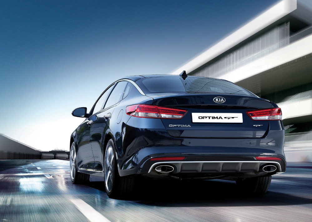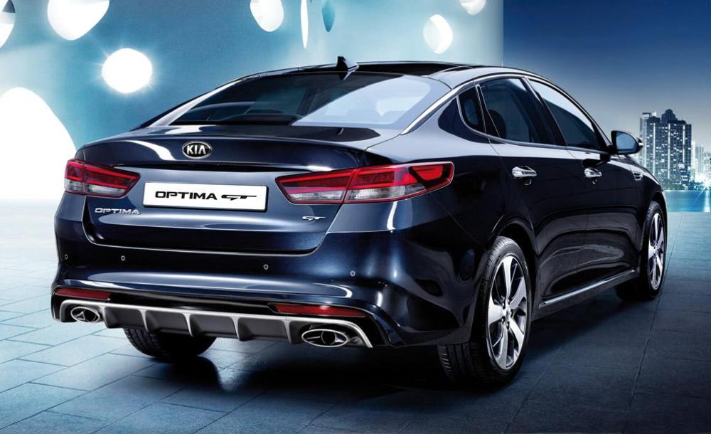 Estéticamente, el KIA Optima GT difiere del Optima estándar en un kit aerodinámico más agresivo, el cual está compuesto por un parachoques de corte más deportivo que integra entradas de aire terminadas en aluminio, taloneras con detalles cromados, un parachoques trasero rediseñado para albergar un enorme difusor con salidas de escape ovaladas y llantas de aleación 18 pulgadas. Por otro lado, también se beneficia de una suspensión reajustada, frenos de disco más grandes, dirección asistida montada en el bastidor y un nuevos sistema de suspensión con control electrónico.