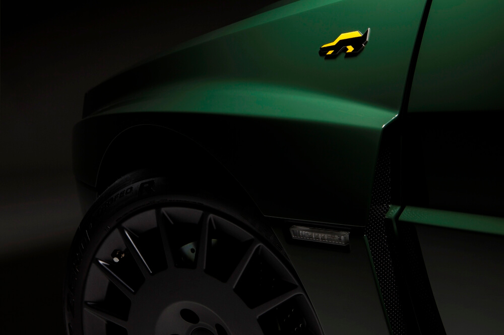 Primero hablaremos del Lancia Delta Futurista. Este vehículo es resultado de un proyecto llevado a cabo en 2018 por Automobili Amos. La compañía italiana fundada por el piloto de carreras Eugenio Amos nos presentó hace tres años una versión actualizada de un Delta Integrale de 1989 equipada con una carrocería de aluminio hecha a mano que integra un frontal de fibra de carbono, guardabarros ensanchados y un alerón trasero. El conjunto está terminado en Verde Brinzio y presenta detalles amarillos en la parrilla y los logotipos.