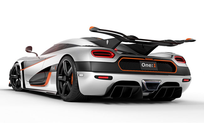 Al contemplar la zaga del Koenigsegg One:1, es fácil darse cuenta de una de las novedades que incorpora con respecto a los ya conocidos Agera R 2013 y Agera S: el alerón trasero, que en este nuevo modelo adquiere unas dimensiones todavía más generosas (promete 610 kg de apoyo a 250 km/h). Además, los soportes sobre los que se apoya este elemento aerodinámico parten desde la propia cubierta del motor, en lugar de situarse tras este como hasta ahora. Si nos trasladamos a la parte frontal, encontramos unos flaps situados debajo del spoiler delantero.