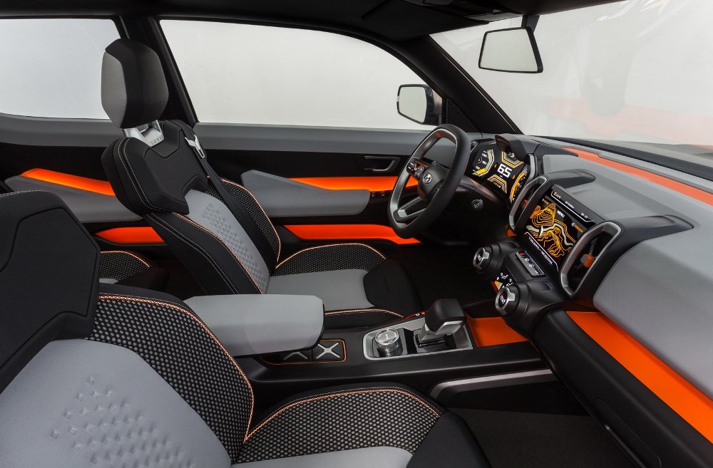El interior presenta también un estilo muy característico. La cabina del Lada 4x4 Vision Concept presenta detalles en naranja, gris y aluminio, un sistema de información y entretenimiento integrado en el salpicadero y flanqueado por salidas de aire a cada lado, un climatizador bizona, un cuadro de instrumentos totalmente digital, iluminación ambiental, un techo panorámico de cristal y un volante multifunción de tres radios.