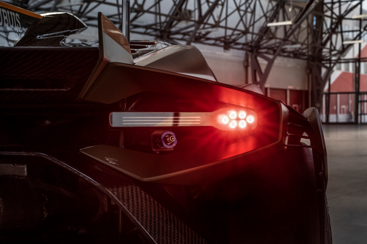 En la zaga predomina el alerón de carbono, destacando por su minimalismo y ligereza. Los marcos de los pilotos de LED homenajean al Lamborghini Countach (prueba) y acompañan al parachoques de carbono en forma de arco. También se integran nuevos apéndices aerodinámicos de fibra de carbono situados tras las ruedas junto a las rediseñadas aletas del difusor. Otros cambios importantes los encontramos en los revestimientos de los umbrales de las puertas y los pasos de rueda traseros compuestos por un único elemento.
