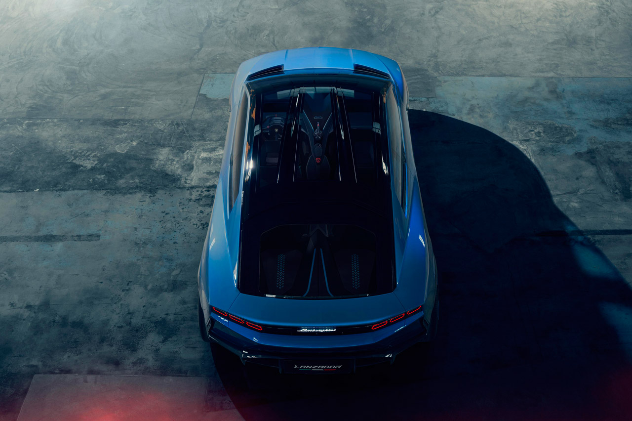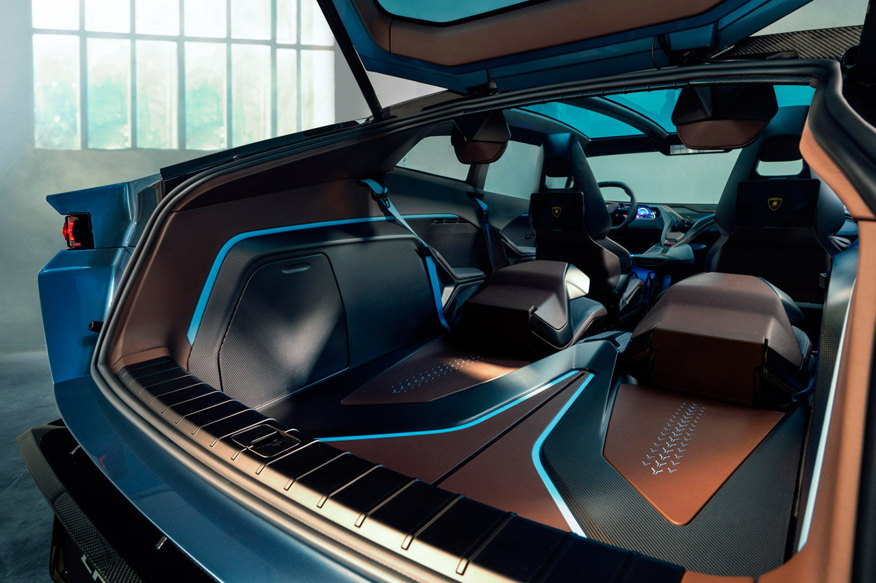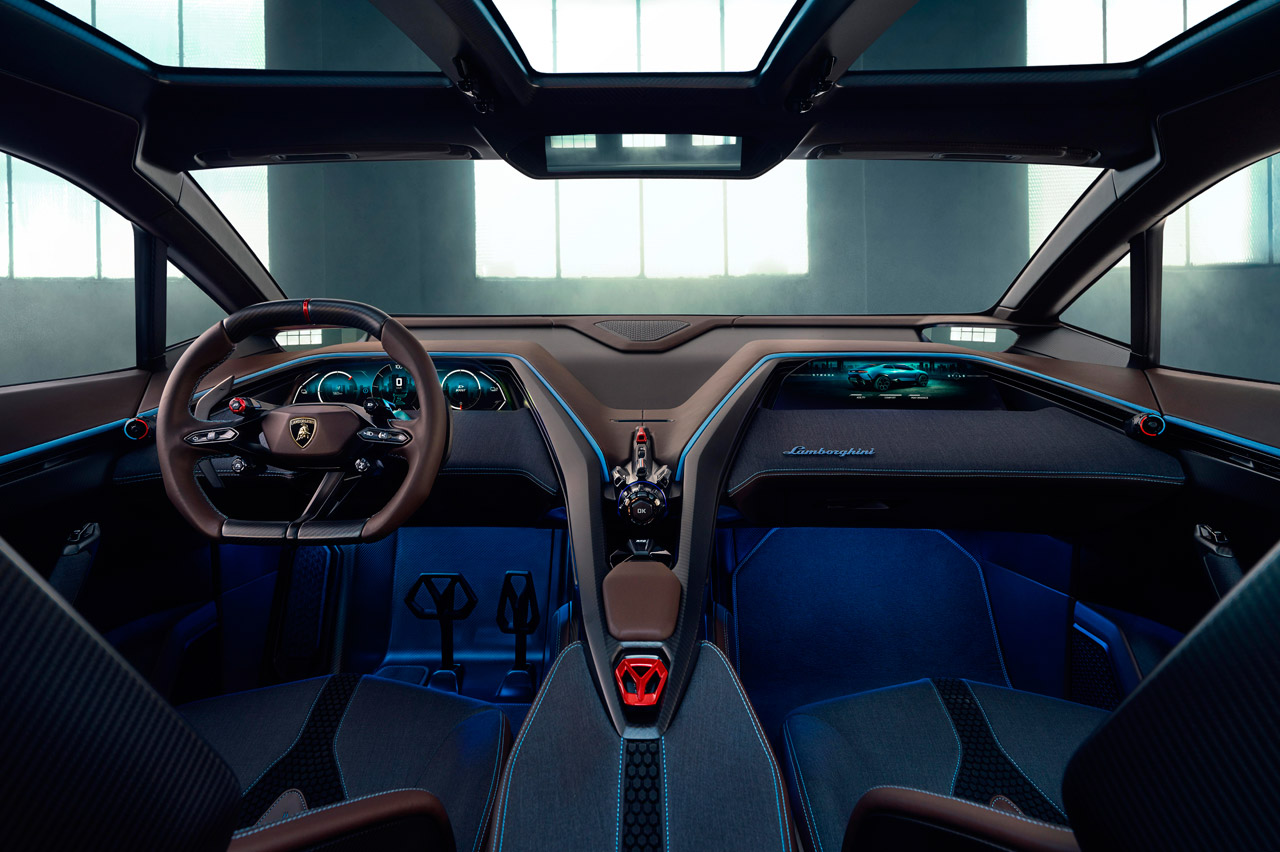 A pesar de que sigue teniendo la superficie afilada de otros Lamborghini, este deportivo eléctrico rompe con la tónica habitual de la marca italiana al ser un modelo con segmento indefinido. Todo su exterior es obra de Mitja Borkert (jefe del Centro Stile Lamborghini), que imita a un caza de combate.