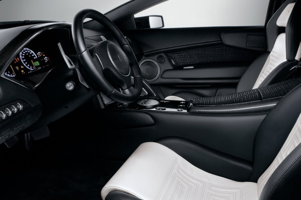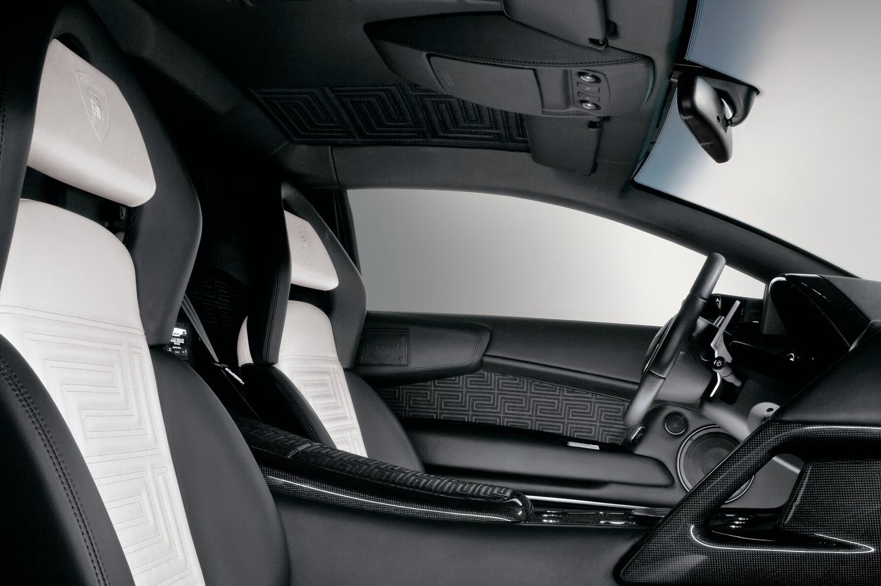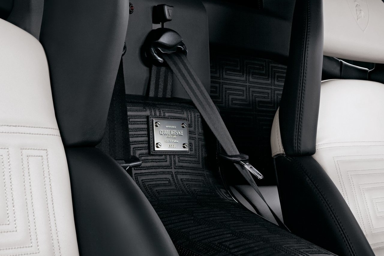 Los diseñadores de la Maison Versace trabajaron junto con Lamborghini para añadir esas mejoras al coche. La parte inferior del salpicadero, las puertas, el panel del techo, la consola central y los asientos estaban tapizados en un exclusivo cuero napa plena flor, con un tramado en forma de greca, símbolo inconfundible y distintivo de la firma de moda.