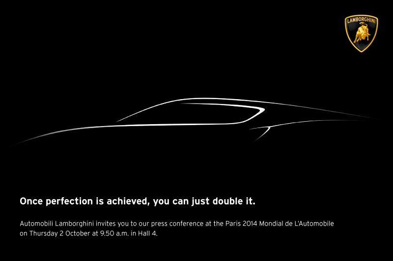 La casa de Sant'Agata Bolognese mostrará un nuevo vehículo en el Salón de París 2014. No se sabe si será un coche de producción o un prototipo. Solo ha avanzado un teaser en el que se puede leer el mansaje “Una vez que se ha alcanzado la perfección, solo puedes duplicarlo” y en el que también se aprecia una silueta de un automóvil, con línea de techo descendente y amplios pasos de rueda con tomas de refrigeración.