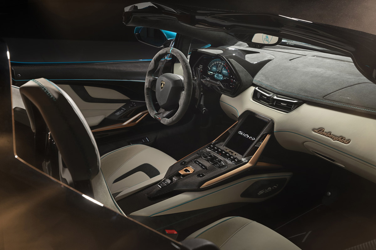Cada uno de los 19 compradores del Sián Roadster podrá configurar el coche a través de Ad Personam, el departamento de personalización de la compañía. La unidad que ves en las imágenes está rematada en ‘Blu Uranus’ que se combina con elementos en ‘Oro Electrum’, que es el color elegido por Lamborghini para identificar sus modelos híbridos. Dentro, nos encontramos con una combinación de blanco con detalles en ‘Blu Glauco’ y elementos decorativos de aluminio, fabricados con impresión 3D, con el mismo acabado dorado que podemos encontrar en el exterior.