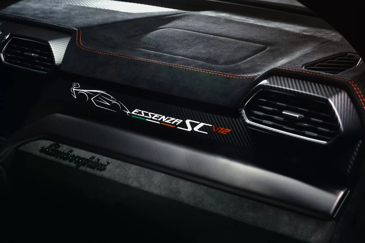 Para el interior Lamborghini ha optado por un enfoque más sutil, sin muchas extravagancias. Los umbrales de las puertas reciben a los usuarios con el logo y la silueta "Essenza SCV12", la tapicería es de Alcantara Nero Cosmus, hay detalles en piel, molduras de fibra de carbono, elementos de aluminio anodizado negro y el Dark Package hace que los tiradores de las puertas sean de color rojo.