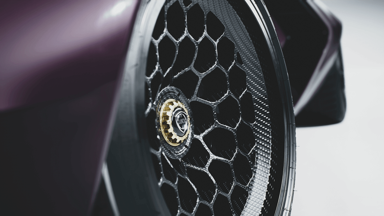 Los grandes pasos de rueda que presenta el Lancia Stratos Zero Restomod integran unas llantas de carbono de bloqueo central con un diseño en panal de abeja muy característico. Los laterales están repletos de pliegues y una gran entrada de aire a cada lado permite refrigerar el motor y concede una gran anchura en el eje trasero, complementado por unas llantas de gran diámetro.