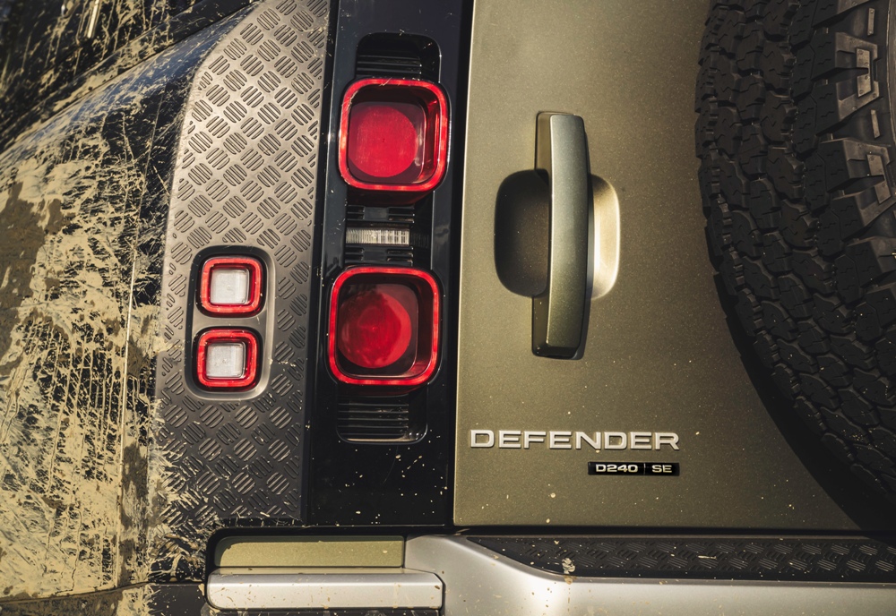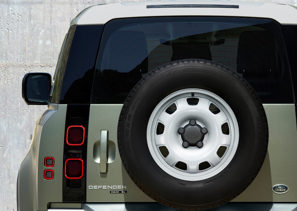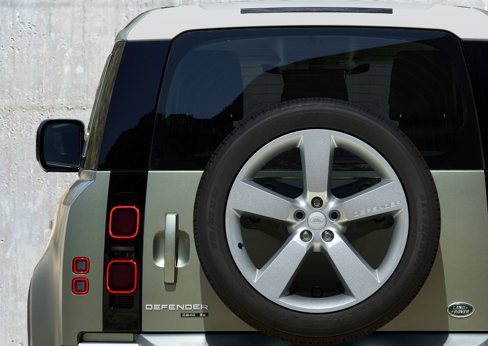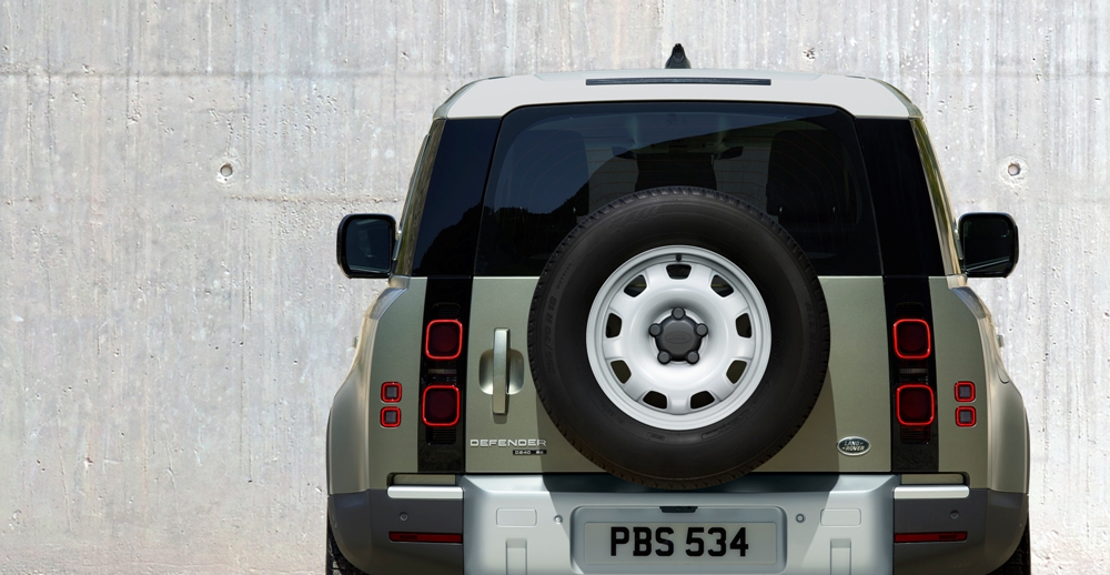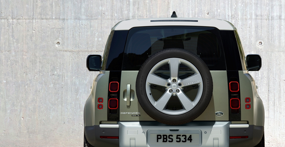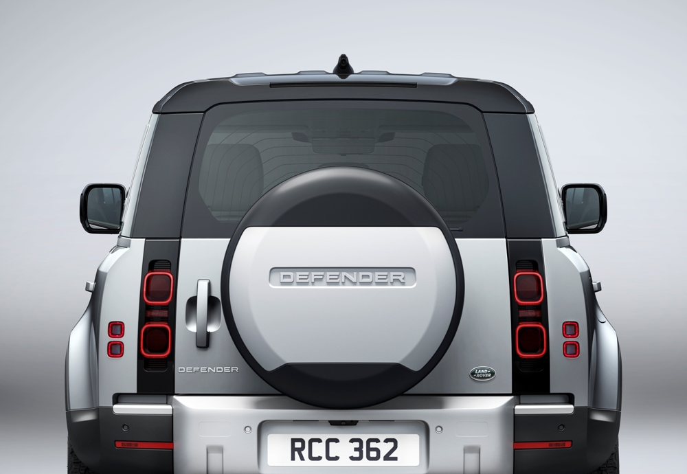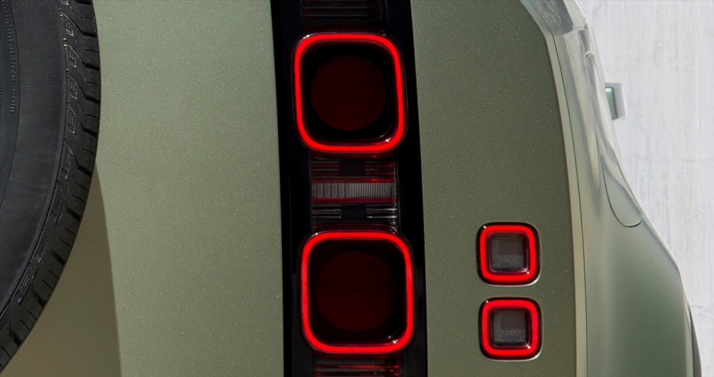 De aspecto mucho más moderno que el clásico modelo, el Defender aún conserva muchos de los rasgos que lo vinculan directamente con su antepasado. Las líneas cuadradas de la carrocería, con un techo plano (pintado en blanco, negro o color carrocería), pilares claramente definidos, un capó plano con una elevación central, los modernos faros con la luz de circulación diurna redonda (un guiño al Defender original), los faros traseros verticales, el portón del maletero con bisagras laterales o la rueda de repuesto instalada en el maletero (cubierta o al aire), son solo algunos de sus atributos.