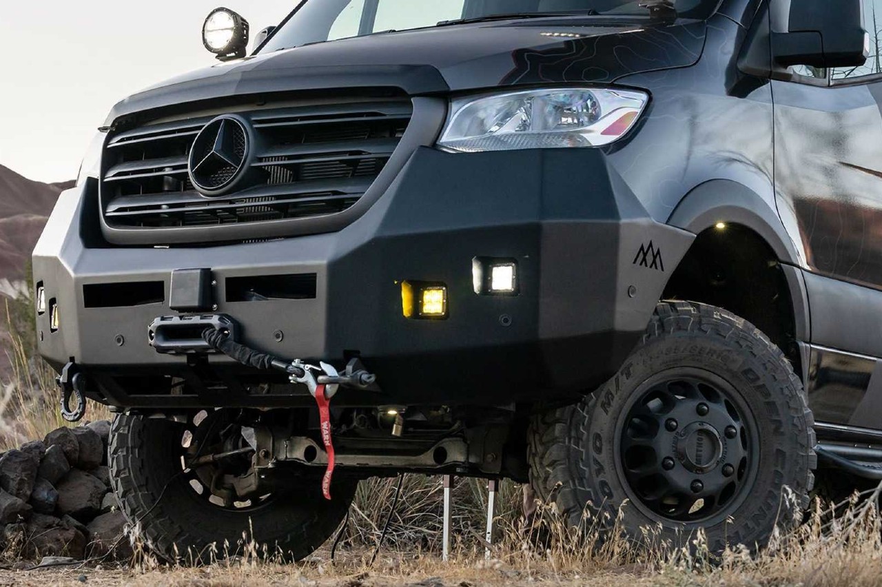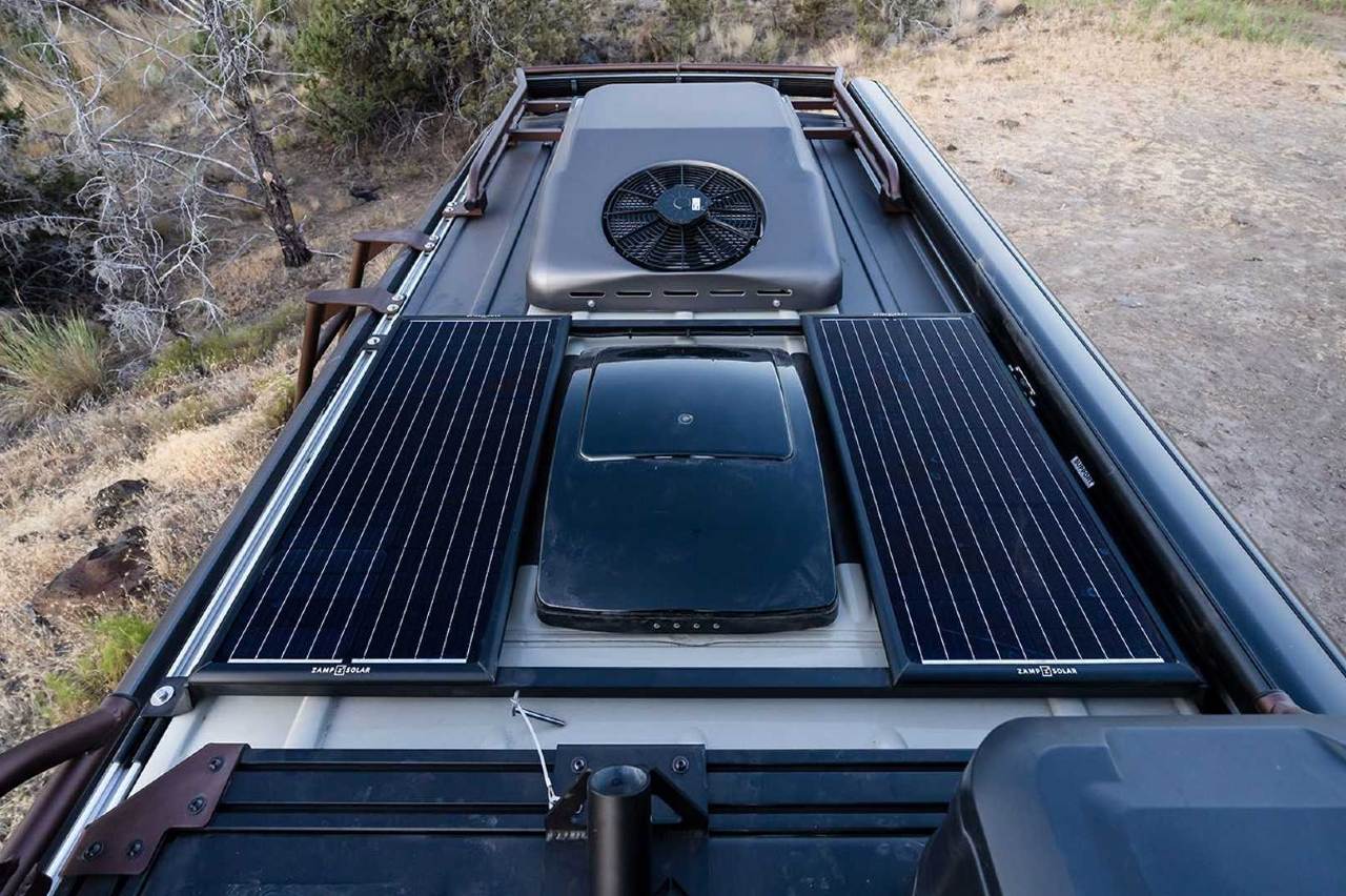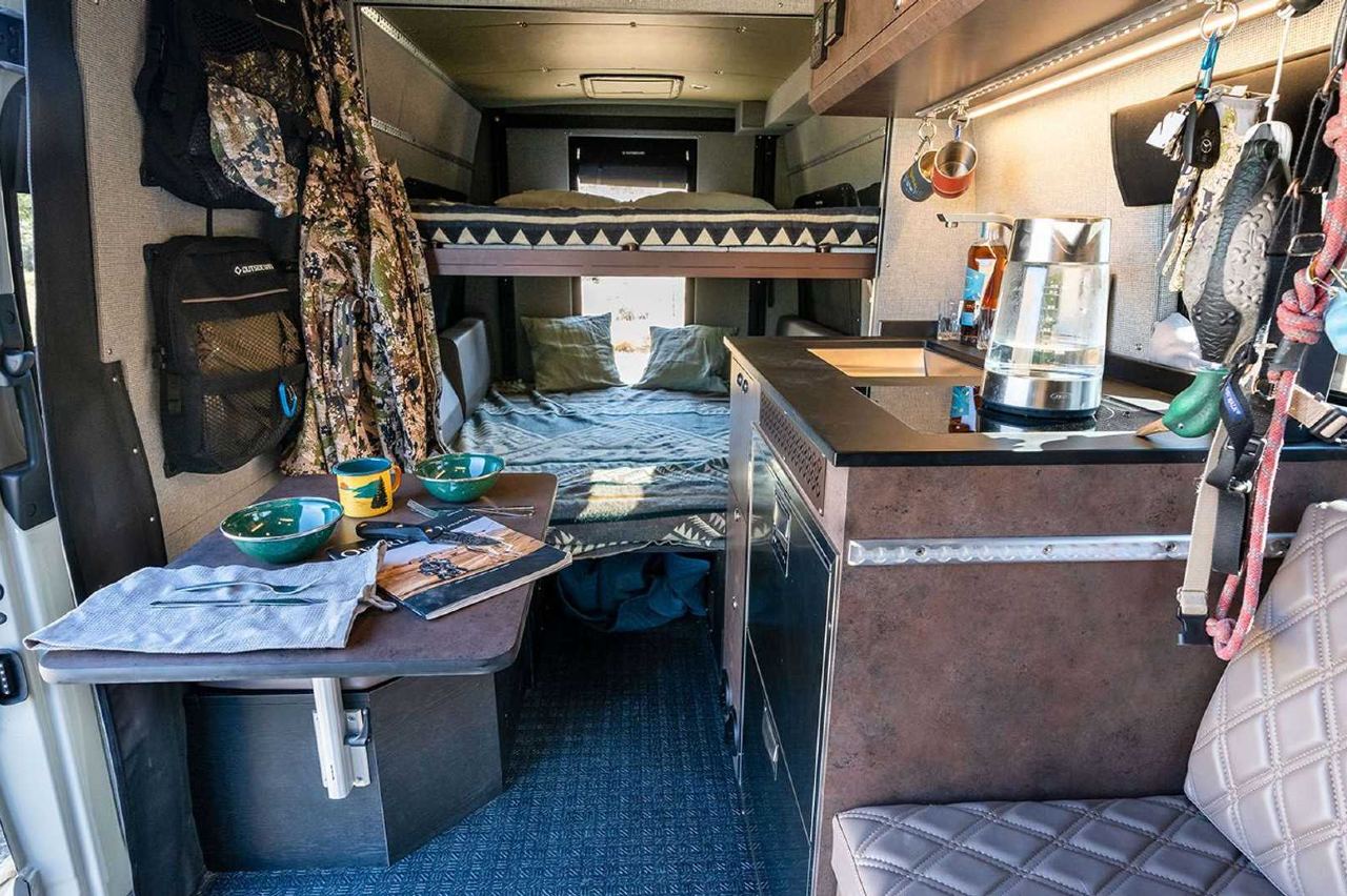 Hasta ahí es una camper normal, pero después están todos los accesorios centrados en la caza que puede montar: las ruedas traseras dobles permiten salir sin problemas del asfalto, hay multitud de armarios, tanto internos como externos, para llevar armas y equipamiento de todo tipo; la suspensión está reforzada, hay múltiples focos exteriores e incluso una hamaca desplegable para situarla en el techo.