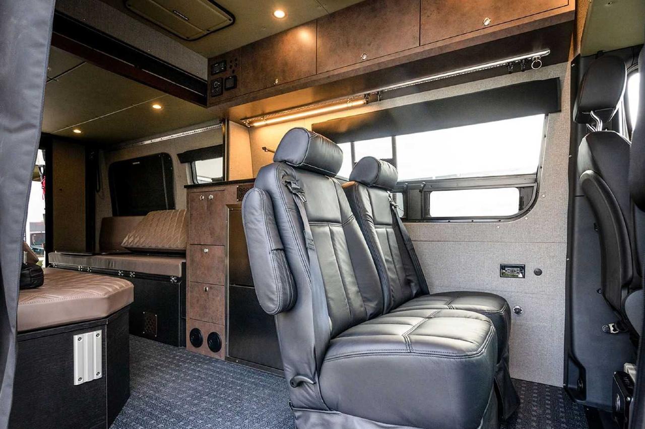Así, en la parte delantera a priori van ubicadas cuatro sillones tipo capitán para un máximo confort, pero los dos traseros pueden ser reemplazados por una bancada. Tras esto se encuentra la zona de salón/cocina, que cuenta con un sofá, una pila, nevera, una cocina por inducción y puede transportar hasta 113 litros de agua. Tampoco falta el sistema de aire acondicionado y la calefacción, con baterías independientes e incluso paneles solares para el techo. En la parte trasera se puede optar también por varios formatos, desde sofás a camas.