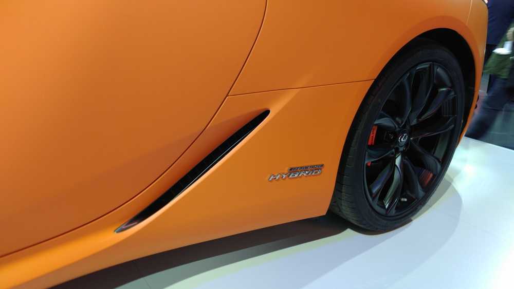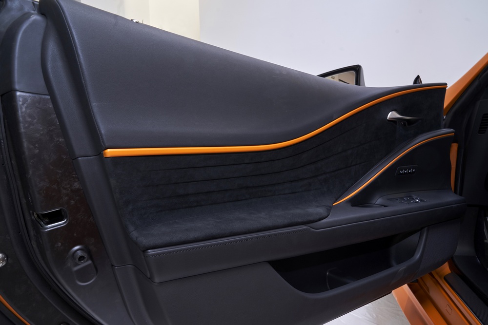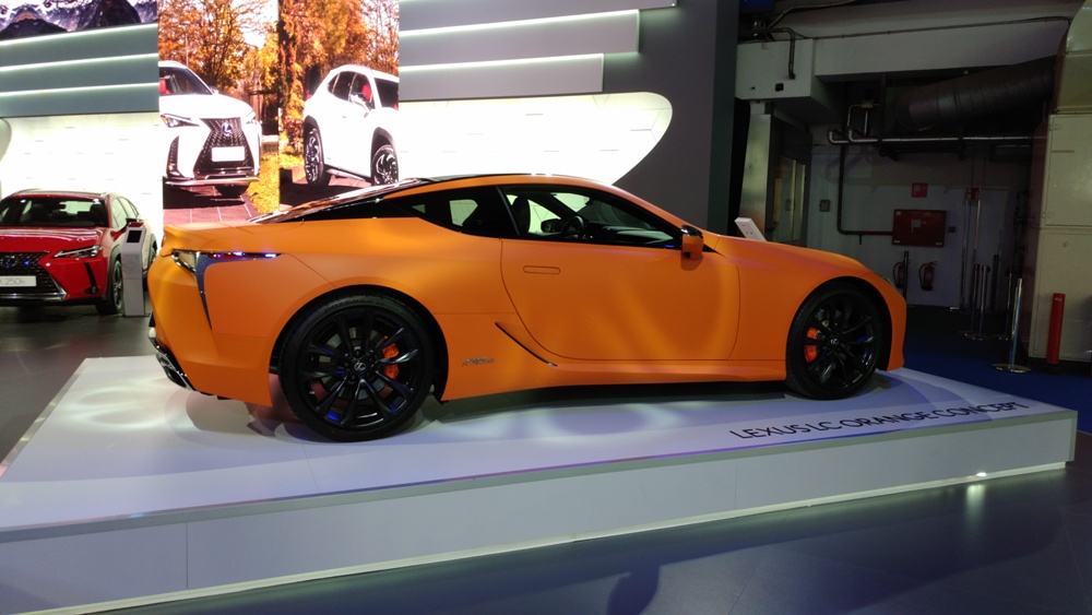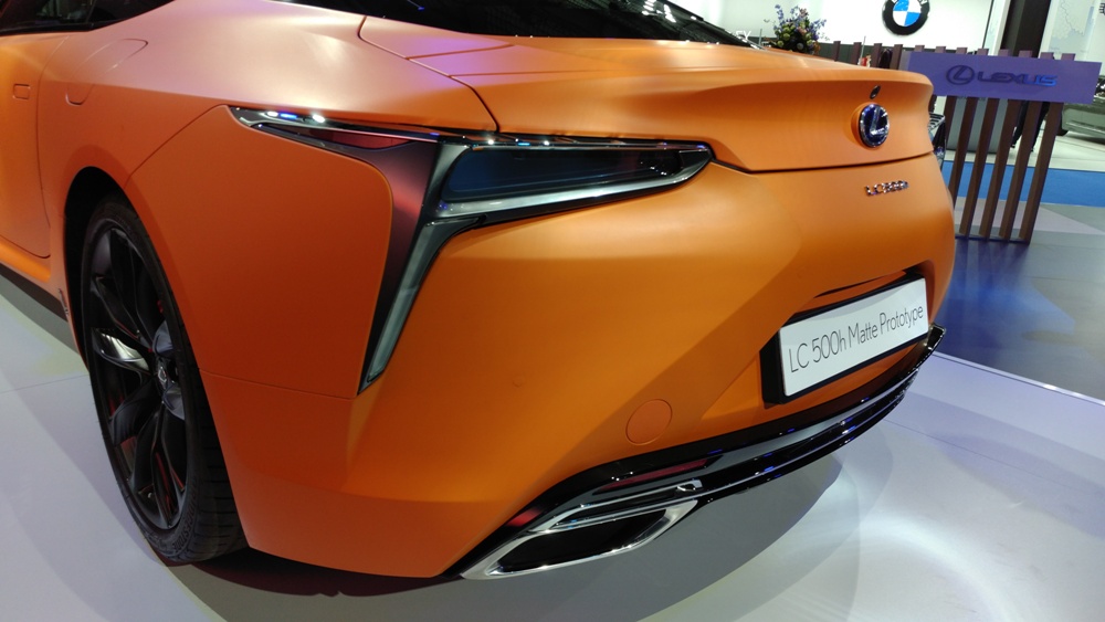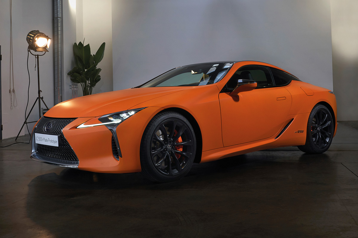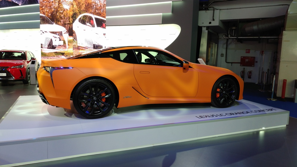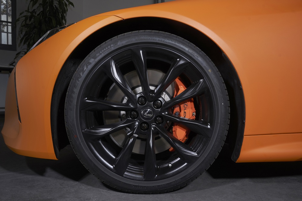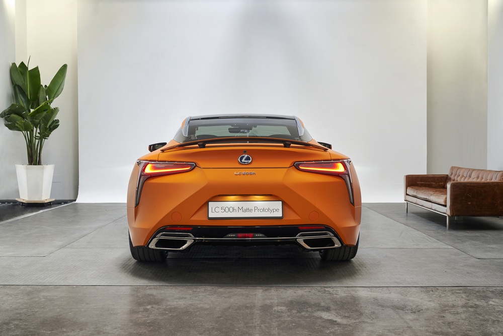 Según Lexus, el color ‘Space orange’ del Lexus LC 500h ‘Matte Prototype’ está inspirado en los tonos naranja que se pueden apreciar cuando miramos al Sol durante los atardeceres. Se trata de una pintura con acabado mate que resalta las líneas afiladas de la esbelta carrocería del coupé, un tono que además contrasta con el negro de las llantas de 21 pulgadas de diámetro o con la fibra de carbono vista con la que están realizados el alerón trasero y el techo.