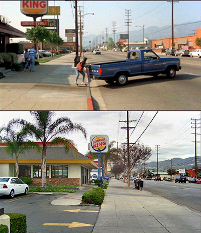 Tras intentar tocar su guitarra en el garaje de Doc, Marty se marcha al colegio con su monopatín e impulsado por un pick-up. En esta primera escena de 'Regreso al Futuro' se aprecia un Burguer King a la izquierda que, como es de esperar en el país de la comida rápida, el restaurante sigue en el mismo lugar tres décadas después (enlace en Google Street View).