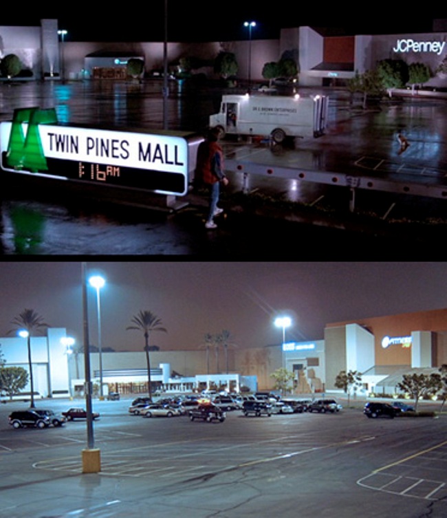 Este emplazamiento es el lugar donde Doc prueba por primera vez el DeLorean y realmente es un centro comercial. Lo único del decorado es el cartel, ya que el centro comercial se llama Puente Hills Mall (enlace en Google Street View).