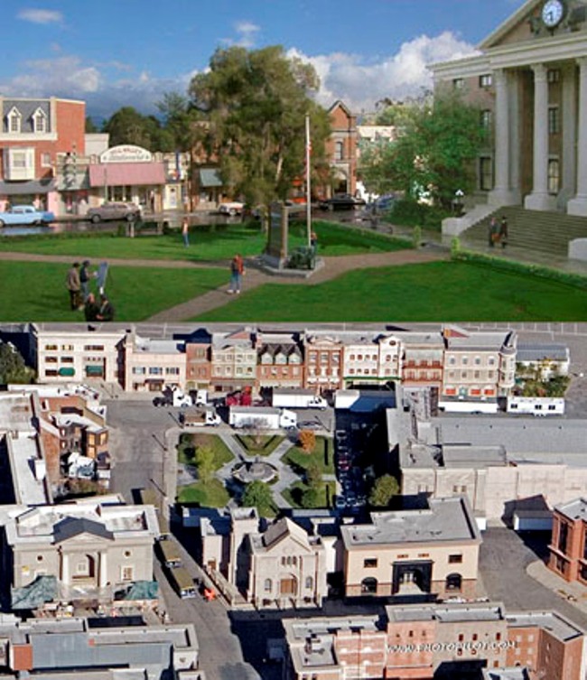 Hill Valley es la ciudad ficticia donde ocurren todas las aventuras de la saga 'Regreso al Futuro'. La famosa plaza es uno de los emplazamientos que realmente no existe como tal, ya que es uno de los decorados de los Studios Universal en Hollywood. Por desgracia, el incendio de 2008 devastó estos decorados, así como otros de las películas 'King Kong', 'Psicosis' y una réplica de la ciudad de Nueva York (enlace en Google Street View).