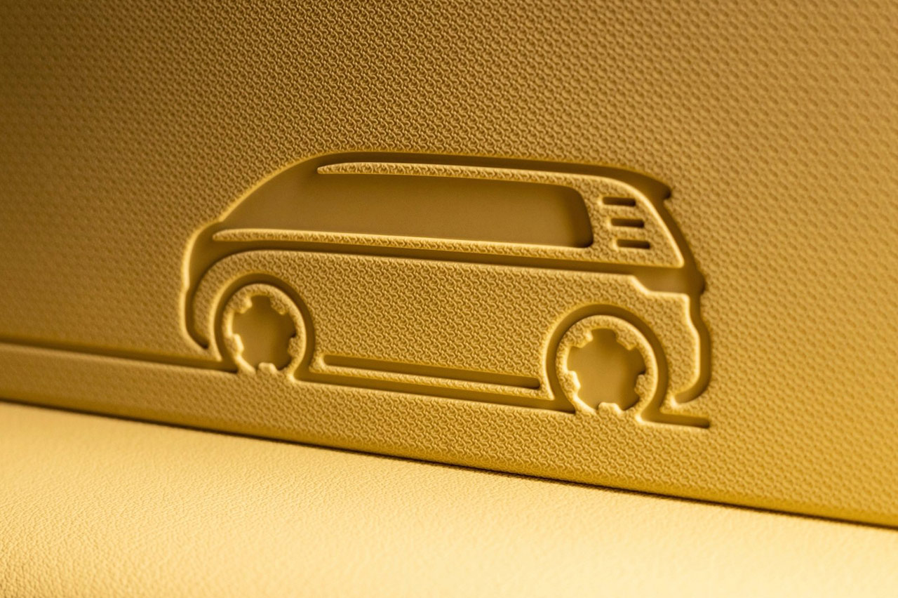 En el interior del nuevo Volkswagen ID.Buzz puedes encontrar numerosos Easter Eggs en forma de siluetas del ID.Buzz moldeadas o impresas en los plásticos. Como puedes apreciar en la foto superior o en la imagen de portada del artículo, esbozan a la perfección las señas de identidad del diseño exterior de este eléctrico de inspiración retro.