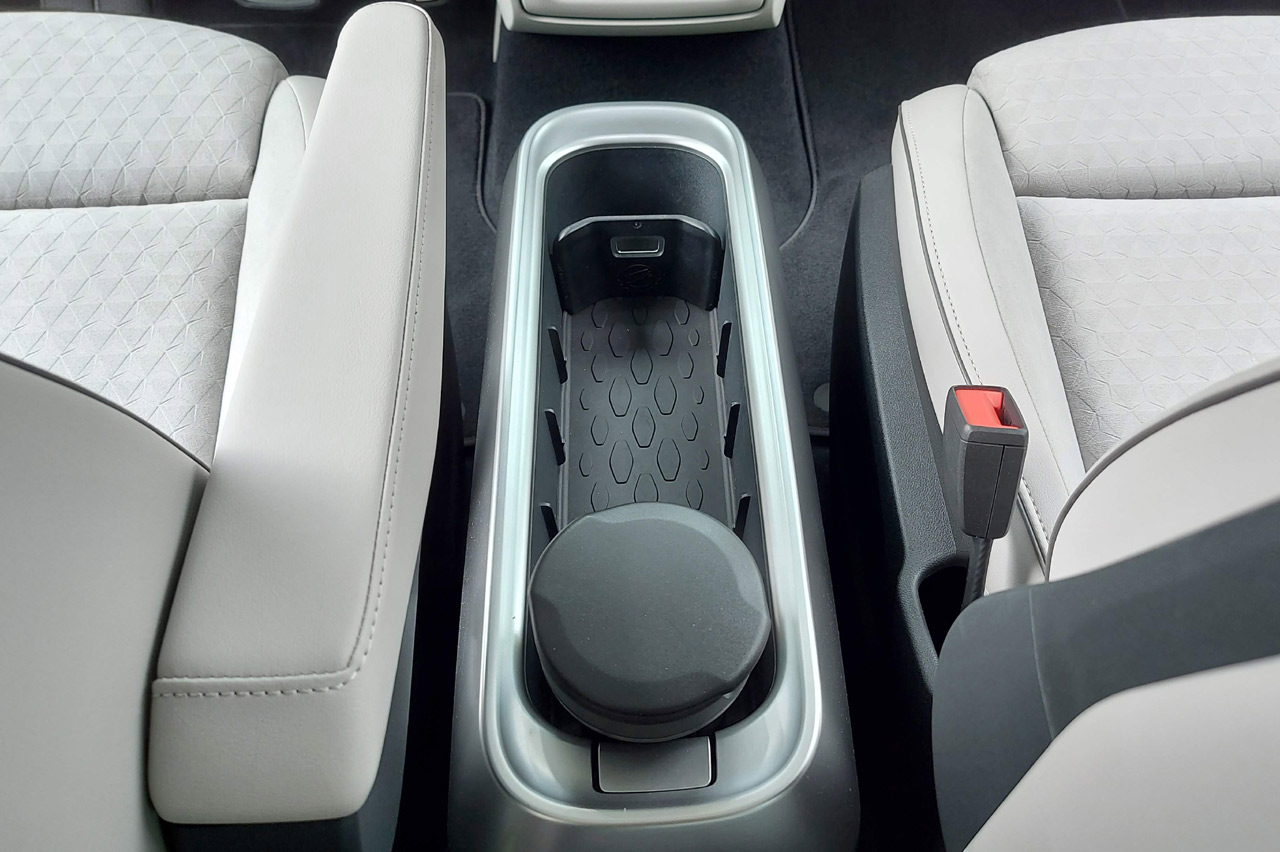 La consola central que hay disponible para el ID.Buzz no solo es práctica, también está llena de Easter Eggs. En la parte superior delantera, justo entre los asientos delanteros, hay un compartimiento abierto pensado para dejar bebidas u objetos.