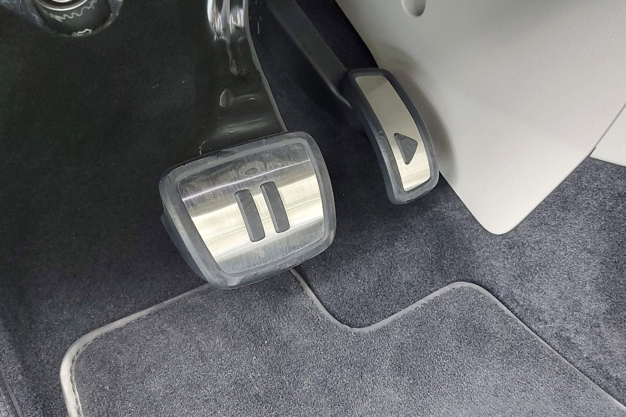 El ID.Buzz tiene el símbolo de play y de pausa en los pedales de acelerador y freno, respectivamente. Esta es una característica que comparte con el resto de la gama de productos ID de Volkswagen y que a su vez, ya habíamos visto con anterioridad en coches como el Renault Twingo RS.