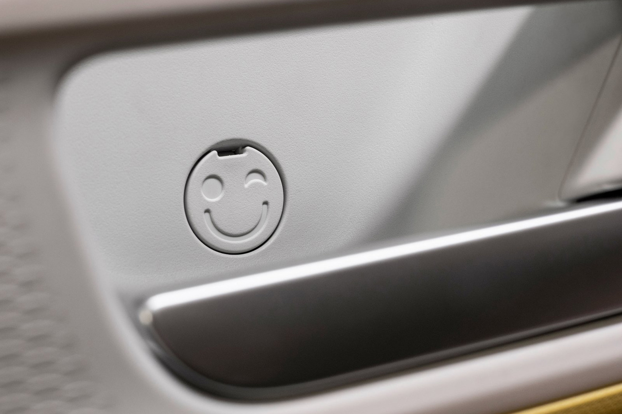 Cuando estás sentado en las plazas delanteras y accionas el tirador para abrir las puertas, podrás ver una pequeña carita sonriente guiñando un ojo. Estas están moldeadas en las tapas de plástico que cubren los tornillos con los que se sujeta el guarnecido a la propia puerta.