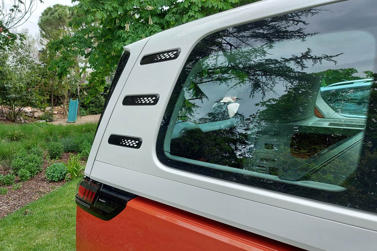 Buenos ejemplos de esto son las molduras decorativas que luce en el pilar D, que son un guiño a las salidas de ventilación que tenía la T1 en esta zona para refrigerar el motor; la presencia de logotipos de VW sobredimensionados; el acabado bitono de la carrocería…