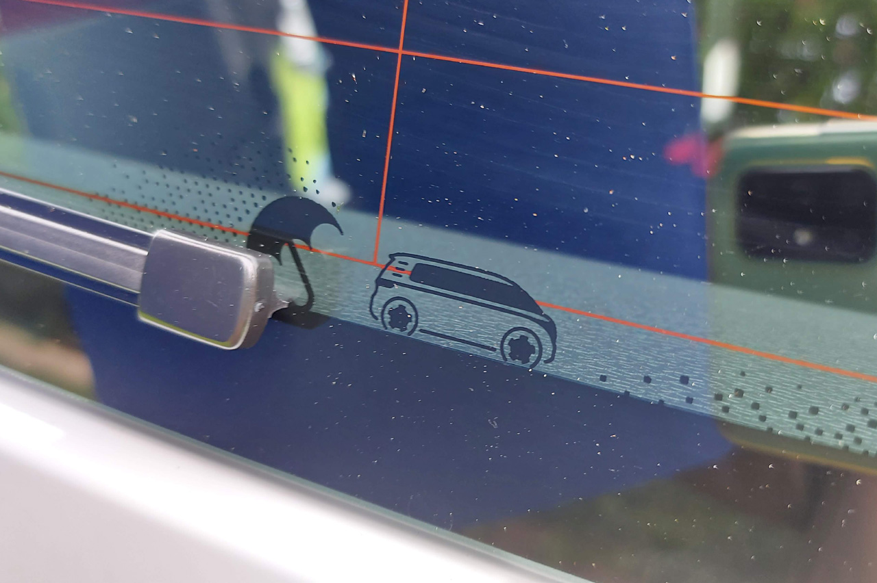 En la luneta trasera, junto al extremo del limpiaparabrisas, hay otra silueta del Volkswagen ID.Buzz. Pero lo mejor es que también hay un paraguas ahí dibujado que solo se muestra cuando el limpia se activa, desvelando en el proceso pequeñas gotas de agua.