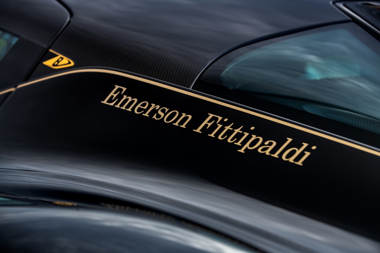 La combinación entre negro y dorado se extiende al habitáculo, donde encontramos la firma del piloto brasileño bordada a mano en el salpicadero y en el asiento del acompañante y un detalle muy especial que sirve de vínculo con el pasado: el volante incluye un selector dorado en la base, de iniciar y detener la marcha, realizado a mano con aluminio reciclado procedente del Type 72 de Fittipaldi.