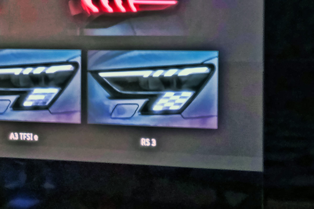 Pues bien, ahora podemos adelantar que los faros de la versión más radical, el Audi RS 3 2021, incorporarán una bandera a cuadros, toda una declaración de intenciones...