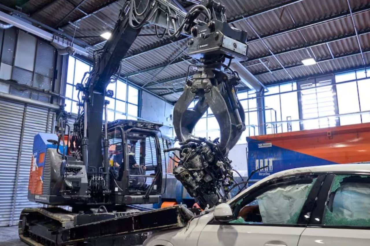 Según la normativa de la Unión Europea, los fabricantes tienen la obligación de recuperar el 95% del peso del vehículo en estas plantas de reciclaje. Esto también afecta a los coches eléctricos e híbridos, empezando por la batería. La unidad se retira del vehículo y los técnicos proceden a realizar pruebas para comprobar si se puede reutilizar. En caso de que haya agotado su vida útil, se prueba cada celda para tratar de aprovecharlas, ya que en Europa se debe reciclar el 50% del peso de la batería y se esperan nuevas medidas en el futuro para el reciclaje del litio.