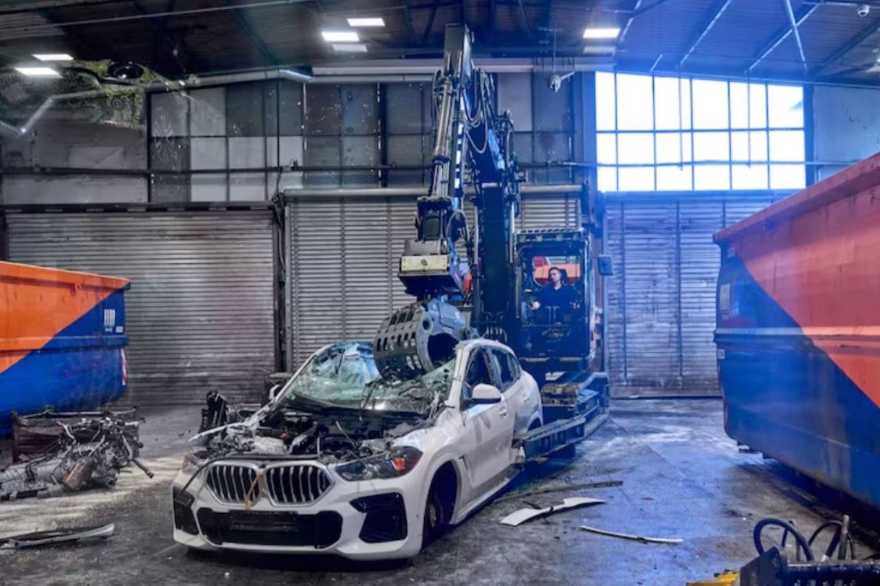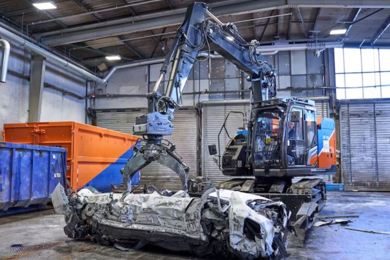 Llegados a la última fase, una excavadora eléctrica de 14,5 toneladas alimentada por baterías recicladas comienza a eliminar partes estructurales del vehículo, como el techo. También se rompen las ventanas y se destroza el habitáculo antes de meter el coche en una prensa, la cual se encargará de compactar lo que queda de él y arrojar una especie de cubo metálico.