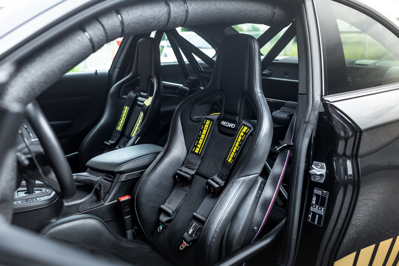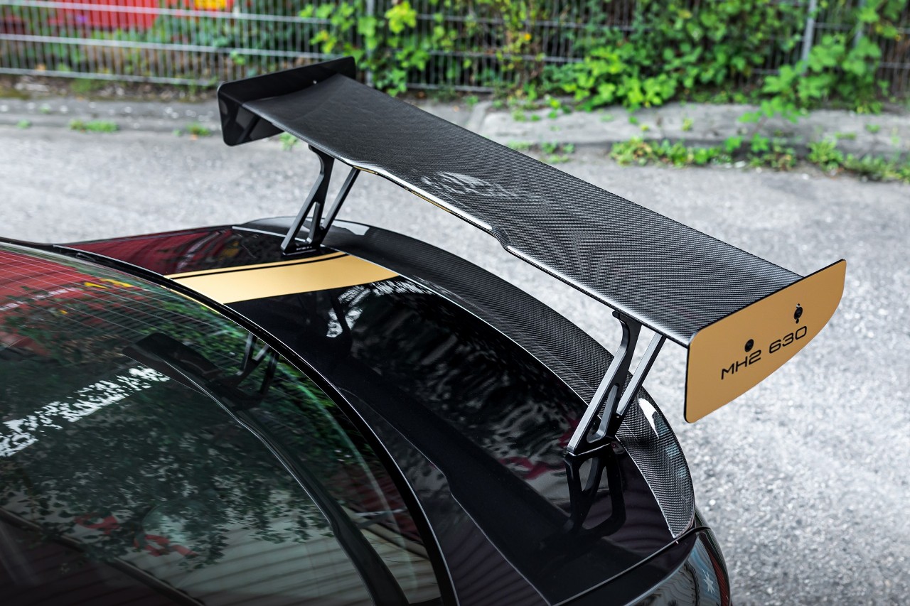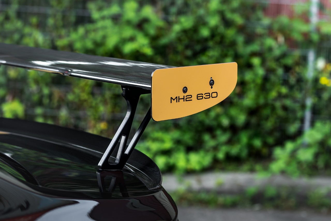 Dentro, encontramos una completa jaula antivuelco, se han retirado los asientos traseros y se han instalado unos arneses Schroth Motorsport, unos asientos Recaro Sportster CS y multitud de detalles en fibra de carbono. Manhart no ha revelado los detalles de los precios del nuevo MH2 630.