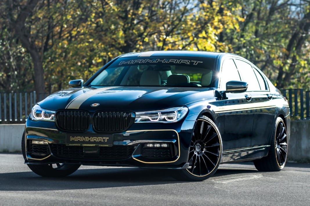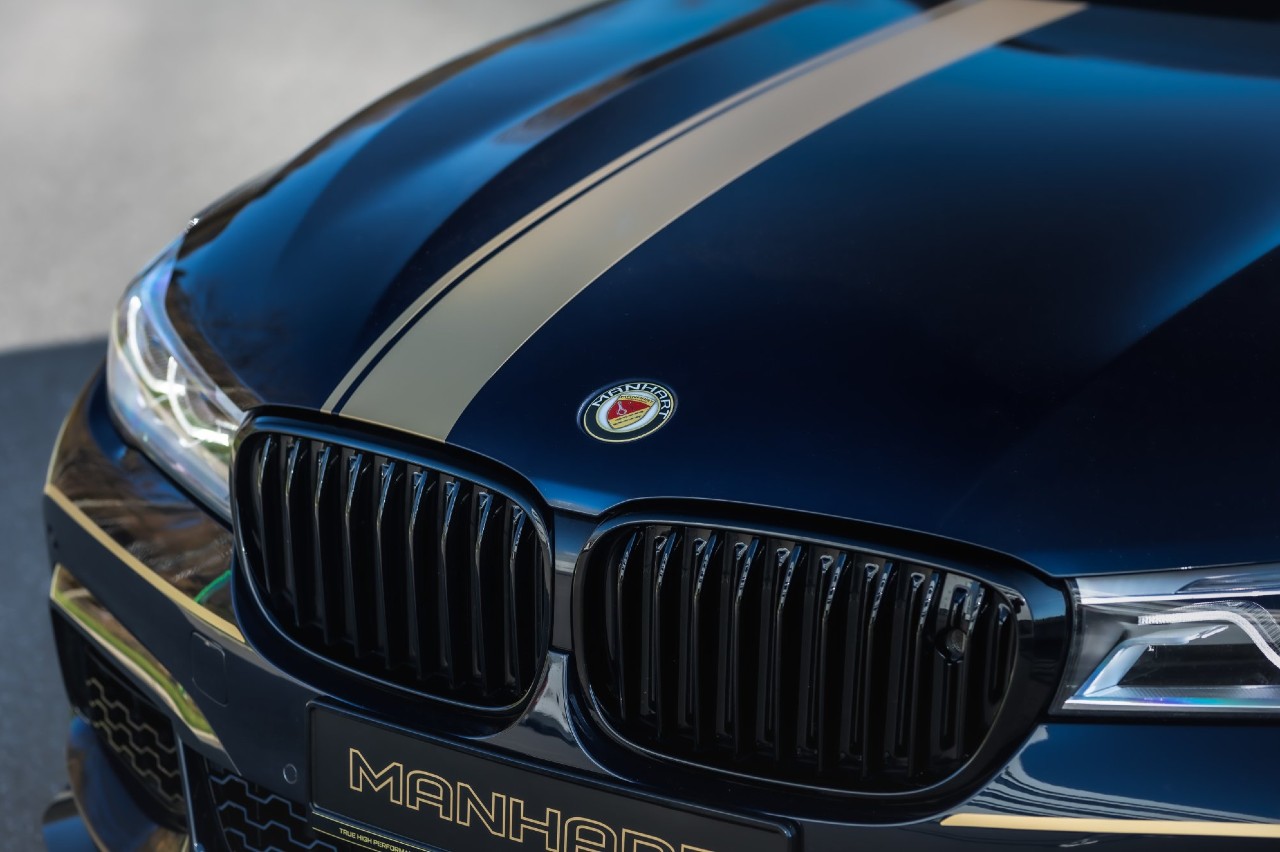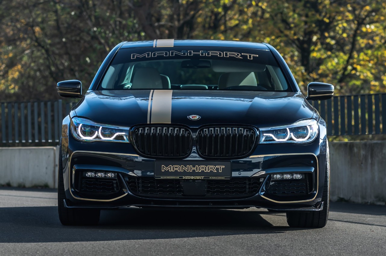 El Serie 7 de Manhart corresponde al modelo anterior al restyling que aplicó la marca alemana en 2019, con el paquete M. Pero las modificaciones aplicadas son compatibles con la versión actualizada. Incluye un divisor frontal con un labio de fibra de carbono, la librea características del afinador alemán, con detalles en dorado e insignias de Menhart, en sustitución de los emblemas de BMW.