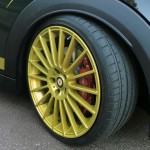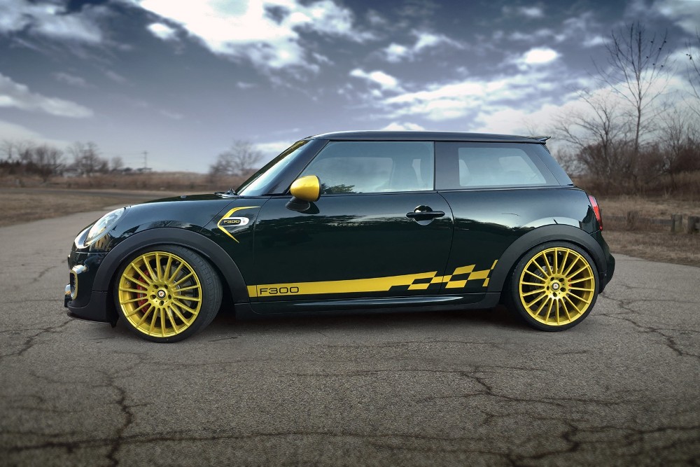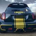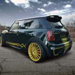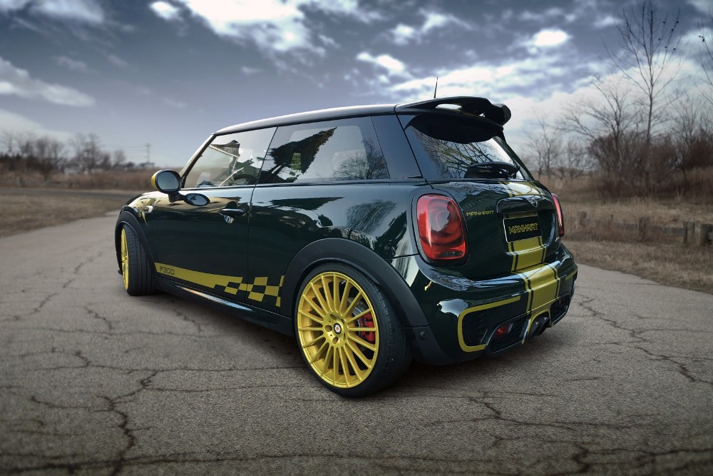 Si el MINI John Cooper Works ya se presenta como la alternativa más radical de MINI, el trabajo realizado por Manhart no lo dejará indiferente. Se presenta terminado en el legendario color British Racing Green con franjas en dorado longitudinales, y con el llamativo color también en el parachoques delantero, las llantas de 19 pulgadas, las carcasas de los espejos retrovisores y los adhesivos laterales.