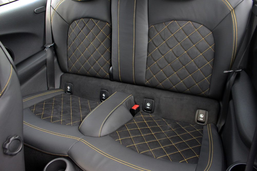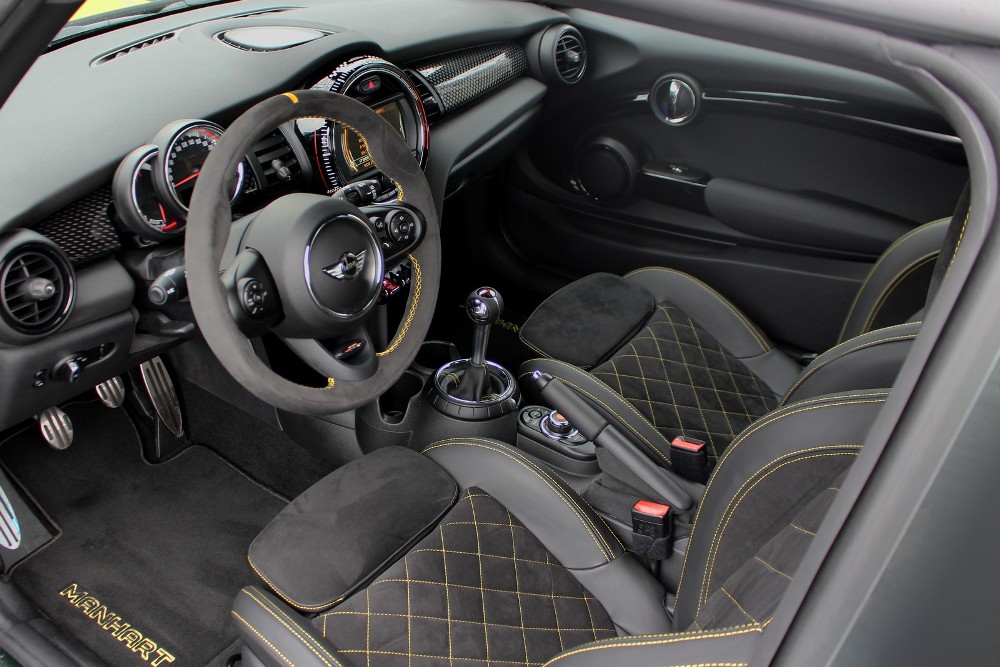 En el interior también encontramos algunos retoques que hacen destacar al MINI F300 de Manhart. Muestra de ello es la piel de primera calidad y la tapicería de Alcántara disponible en el habitáculo así como en el volante, costuras en contraste ideal dorado y alfombrillas de velours con logotipos bordados de 'Manhart'.