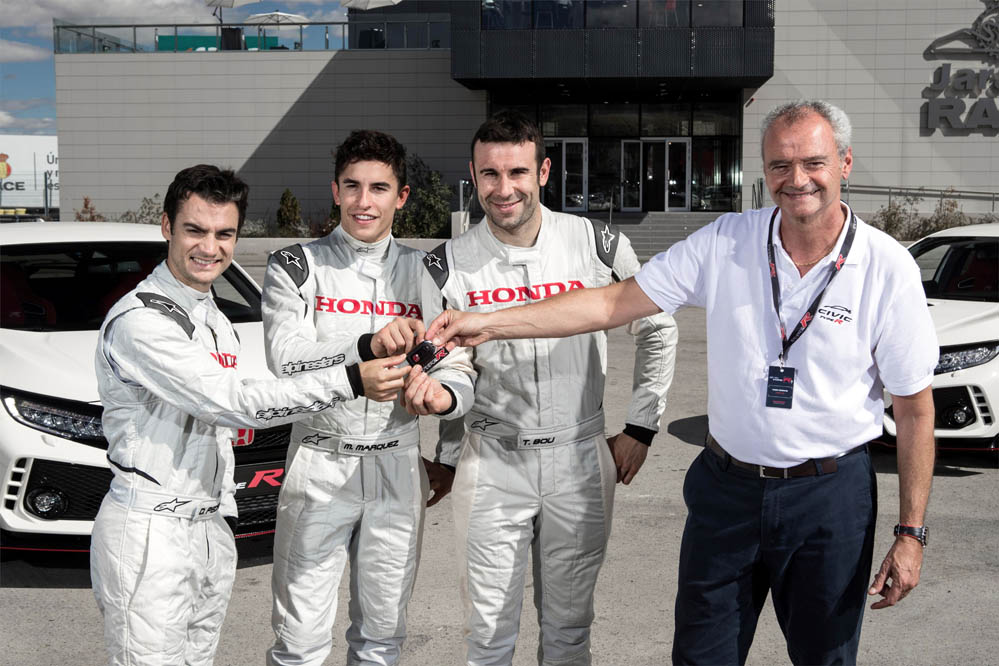 El encargado de hacer la entrega de los Honda Civic Type R 2017 a Marc Márquez, Dani Pedrosa y Toni Bou ha sido Marc Serruya, presidente de Honda Motor Europe España.