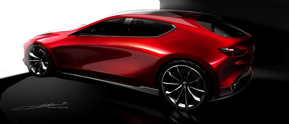 El estudio de diseño de Mazda presenta un frontal dominado por una parrilla de grandes dimensiones flanqueada por faros empotrados y un splitter delantero. Las líneas de la carrocería fluyen con suavidad junto a parachoques musculosos, mientras que en la parte superior encontramos un techo panorámico dividido en dos secciones longitudinales, junto a tiradores de las puertas integrados, un sistema de escape doble y un alerón pequeño montada en sobre el portón trasero.