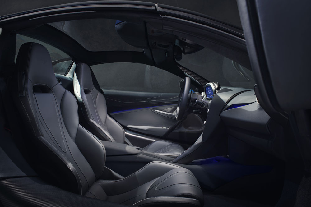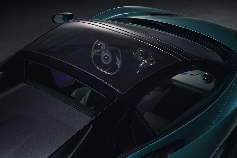 Un techo que por cierto, está realizado en una única pieza de fibra de carbono. Puede abrirse o cerrarse en tan solo 11 segundos a velocidades de hasta 50km/h (su antecesor, el 650S Spider, podía hacerlo a hasta 30 km/h). Además, los compradores pueden optar opcionalmente por montar un cristal electrocromático en la parte central del techo. Este destaca porque es capaz de variar de opaco a transparente con tan solo presionar un botón.