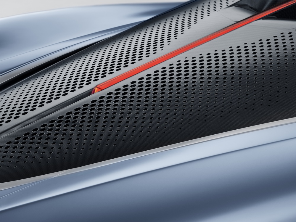 Llaman la atención las cubiertas de las llantas delanteras, especialmente porque las llantas traseras tienen un aspecto más convencional. También destaca el largo voladizo posterior o el techo del habitáculo, que está acristalado prácticamente por completo. Aunque quizá lo más sorprendente de todo sean los dos alerones traseros, que son móviles y tienen la peculiaridad de que carecen de bisagras para posibilitar su desplazamiento. Esto ha sido posible gracias al empleo de una fibra de carbono flexible y de una pintura especial.