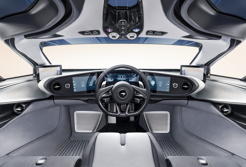 El asiento del conductor en el medio, como sucede en el icónico McLaren F1, si bien, el interior del nuevo McLaren Speedtail cuenta con un tecnológico salpicadero que incorpora hasta cinco pantallas diferentes: la cuadro de mandos, dos más que flanquean a este último (y desde las que se manejan el sistema multimedia y las diferentes funciones del vehículo) y otras dos que hacen las veces de retrovisores.