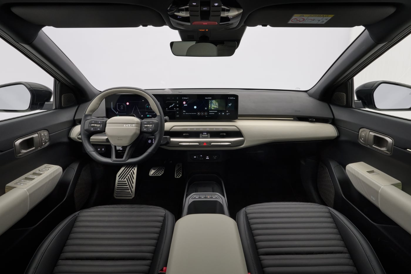 El puesto de mandos es bastante parecido al del EV9 y muy parecido al del EV3. Equipa tres pantallas, que están situadas en una misma superficie. La que hace de cuadro de instrumentos es de 12,3 pulgadas, la del sistema de infoentretenimiento tiene la misma medida y la que se sitúa entre ellas es de 5 pulgadas. Esta, desde la que se controla alguna función del climatizador, sigo viéndola con algo de dificultad, puesto que parte de ella la tapa el aro del volante.