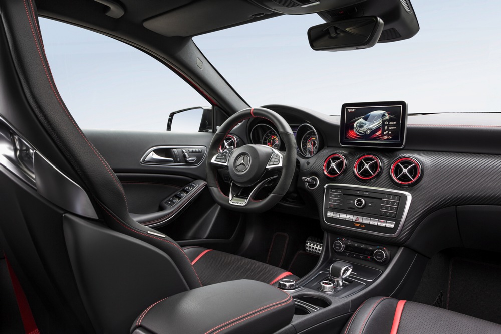 En el habitáculo, el nuevo Mercedes A45 AMG presenta un volante deportivo multifunción con la parte inferior plana y cubierto de cuero perforado en las zonas de agarre. Los asientos deportivos ofrecen ahora la posibilidad de regular la profundidad de la banqueta. Como también ocurre en el resto de la gama del Clase A, la pantalla del sistema de infoentretenimiento de 8 pulgadas y diseño flotante permite conexión Wi-Fi y la integración del smartphone mediante CarPlay y MirrorLink.