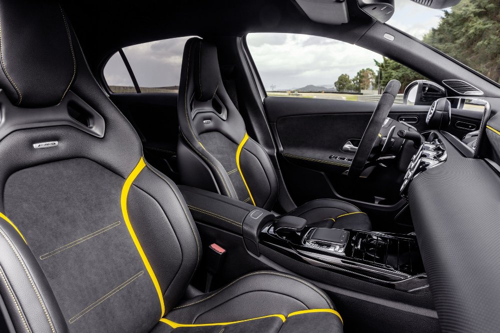 El interior del nuevo A 45 4MATIC+ 2019 es una oda a la deportividad y el estilo, con el sistema MBUX de información y entretenimiento y su doble pantalla como protagonistas. Los asientos están tapizados en cuero Artico y microfibra Dinamica de color negro con costuras dobles, los cuales están acompañados de cinturones de seguridad en color rojo, un color presente en las salidas de ventilación. Una alternativa es el símil de cuero Artico gris y negro con costura doble. En cuanto a la versión S, los detalles pasan de rojo a amarillo, con la consola en negro brillante, pedales de acero inoxidable, alfombrillas y diferentes logotipos AMG repartidos por la cabina.